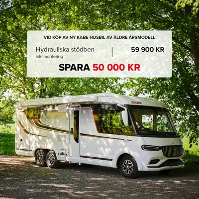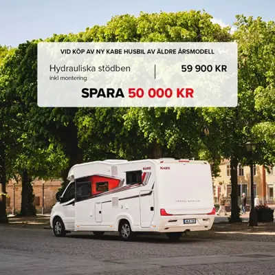 Vid köp av ny KABE husbil av äldre årsmodell erbjuder vi hydrauliska stödben för endast 59 000 kr (Ordinarie pris 110 000 kr) Du Sparar 50 000 kr. I priset ingår monteringen.